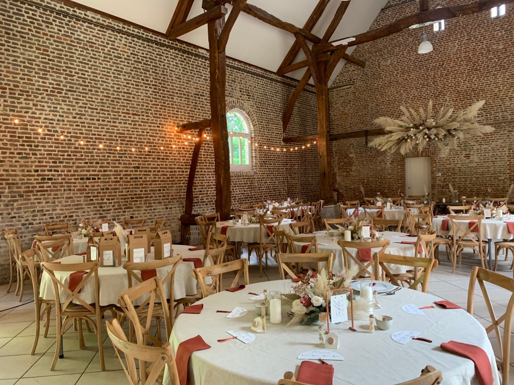 Ancienne grange de caractère, sa construction de briques et de pierres, sous une magnifique charpente traditionnelle, offre une hauteur sous plafond extraordinaire ! Située au cœur du paysage normand, dans un authentique clos-masure, autrefois nommé le « Manoir de Mesnil Varin », elle offre un environnement calme et verdoyant pour célébrer vos événements.
