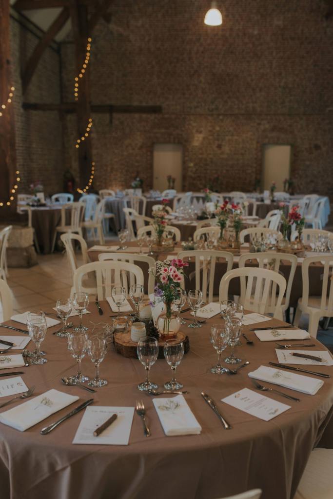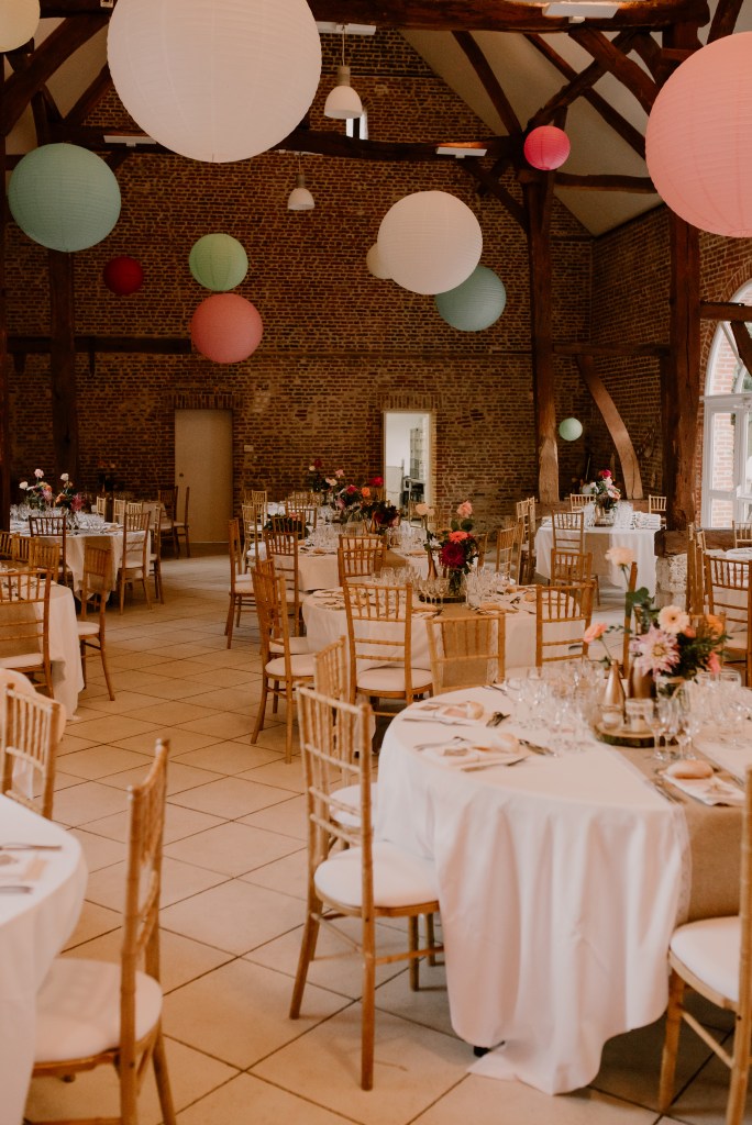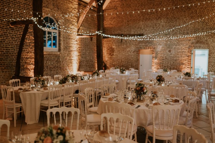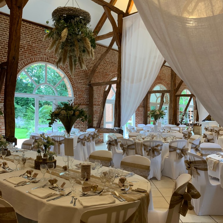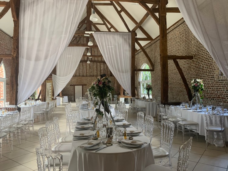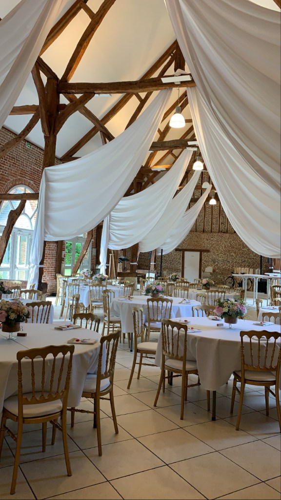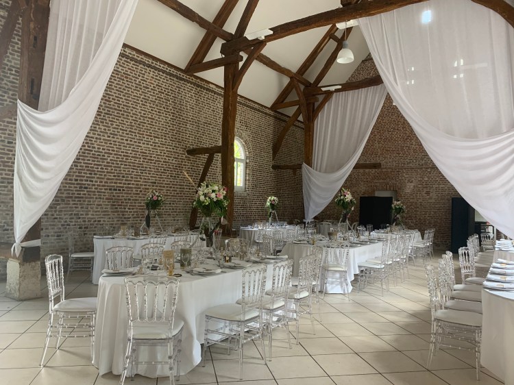 Le mobilier : La salle est équipée de 180 chaises blanches en PVC houssables et de tables rondes et ovales.